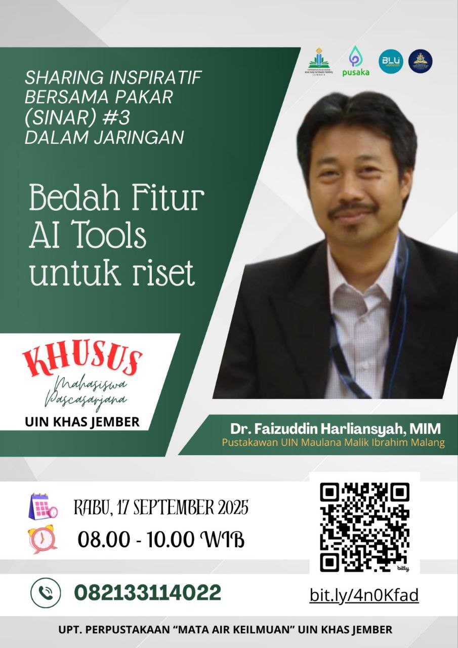 Jember – Pascasarjana UIN Kiai Haji Achmad Siddiq (UIN KHAS) Jember berpartisipasi aktif dalam Sharing Inspiratif Bersama Pakar (Sinar) sesi ke-3 secara daring pada Rabu, 17 September 2025. Kegiatan yang diselenggarakan oleh UPT Perpustakaan UIN KHAS Jember ini mengangkat tema “Bedah Fitur AI Tools untuk Riset”.