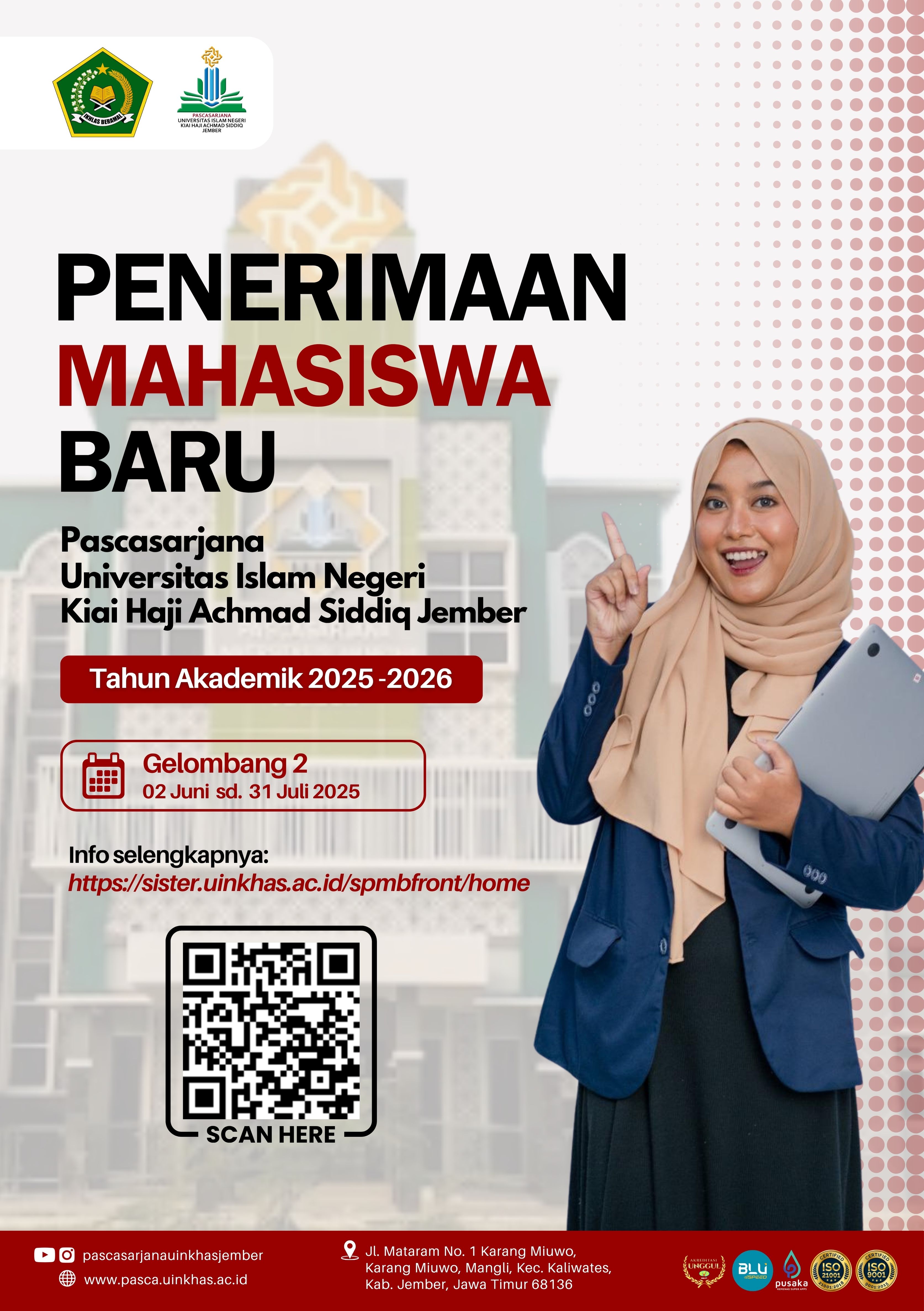 Kami informasikan bahwa besok, Kamis, 31 Juli 2025, adalah hari terakhir kesempatan Anda untuk mendaftar sebagai mahasiswa baru program Pascasarjana UIN KHAS Jember tahun akademik 2025/2026.